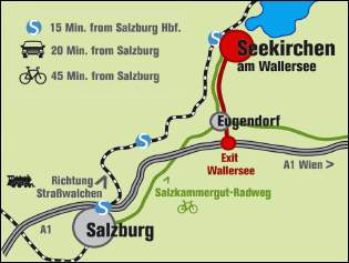 Anreise mit dem Auto: Aus Richtung Salzburg/München oder Wien Autobahn A1 bis zur Ausfahrt Wallersee/Eugendorf, 5 km der Beschilderung "Seekirchen" folgen.